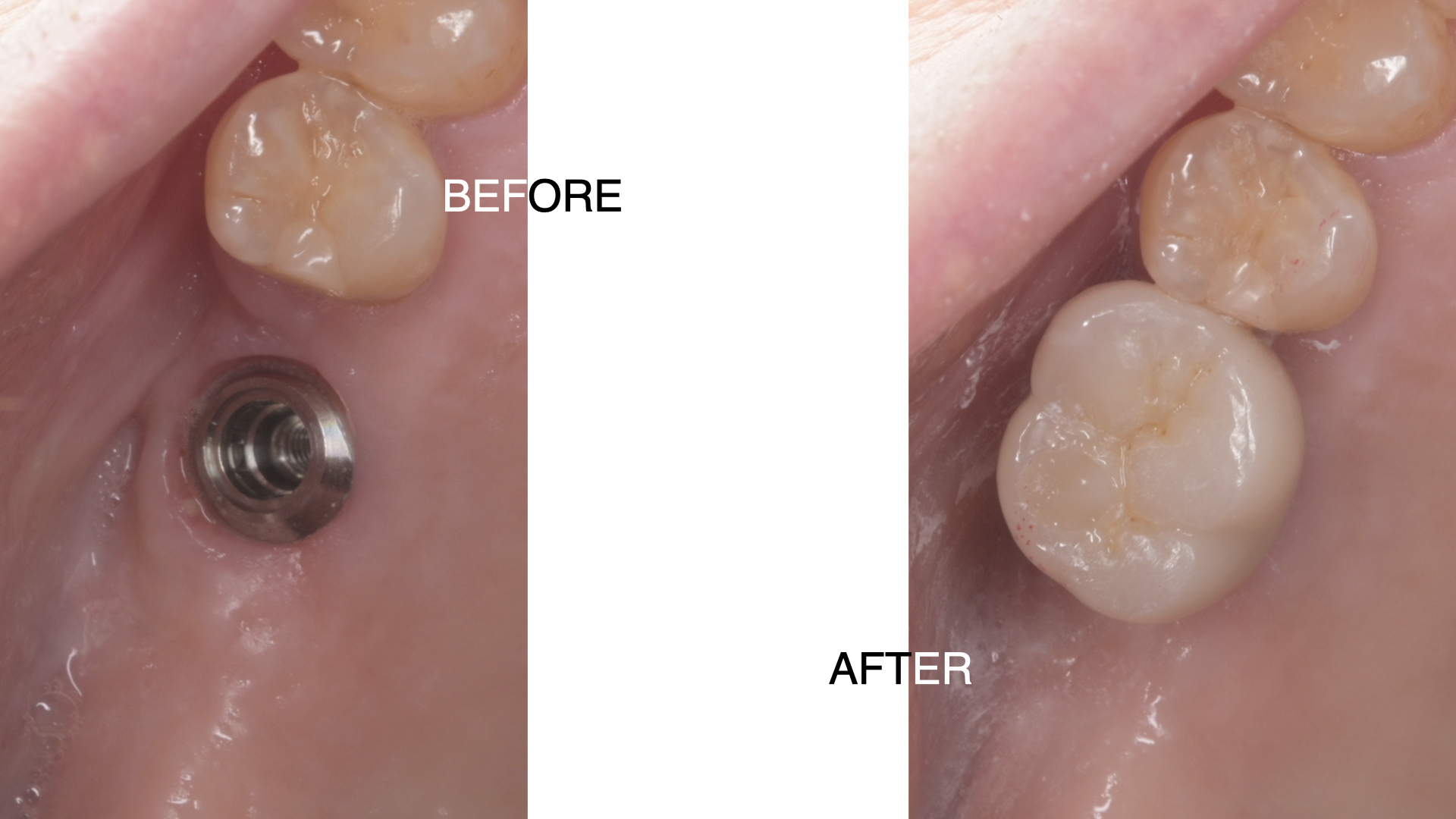 噛むと痛いご来院いただきました。被せ物を外すと割れており、保存不可能のため抜歯と判断しました。インプラント、ブリッジ、入れ歯を提案しました。今回はインプラントを選択されました。まずは手術計画を作成し、同意を得ました。骨の再生を待った後、インプラントを埋入しました。インプラントと骨が引っ付くのを3ヶ月ほど様子見した後、型取りを行い完成品を装着しました。 |